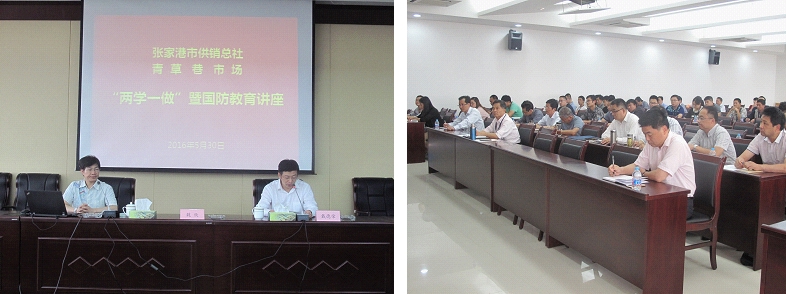 5月30日下午,为加强党员及民兵队伍建设,深入学习贯彻习近平总书记系列重要讲话精神,进一步增强全体党员先进性、民兵国防意识和责任感,市供销合作总社、青草巷市场在青草巷市场3号楼7层大会议室开展“两学一做”暨国防教育讲座。讲座分两个议程:第一个议程(下午1:30—3:00)由市委党校魏欣副校长为大家做“两学一做”专题讲座。魏校长通过“中国梦”、“两个一百年”、“三严三实”、“四个全面”、“五大理念”等习近平总书记治国理政思想的精彩阐述,突出了总书记治国思想核心理念是为人民担当,奋斗目标是实现“中国梦”,最后引申出如何做一名合格党员;第二个议程(下午3:10—5:00)通过观看《让历史警示未来》的历史记录教育片,让我们以史为鉴,勿忘国耻,要立足国防建设,向着中华民族伟大复兴的目标奋勇前进!