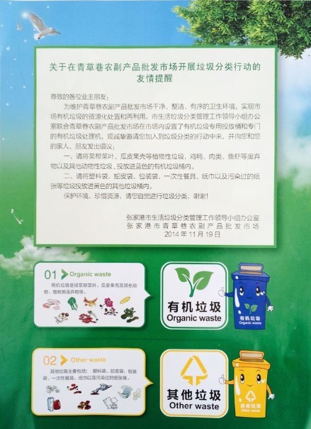 2014年11月22日下午,市生活垃圾分类管理工作领导小组办公室联合青草巷市场在市场内开展垃圾分类倡议行动,倡议市场经营户自觉进行垃圾分类(有机垃圾和其他垃圾),共向市场内经营户发放垃圾分类宣传资料800余份。