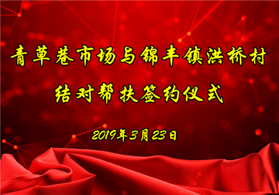3月23日下午,青草巷市场与锦丰镇洪桥村结对帮扶签约仪式在市场③号楼310会议室举行,签约仪式上,青草巷市场总经理戴德荣、洪桥村党总支书记毛虎分别代表青草巷市场和洪桥村共同签署了《帮扶协议书》。市供销合作总社党委书记、主任唐雷刚,冶金工业园党工委副书记、锦丰镇镇长沈晓波代表见证方市供销合作总社和锦丰镇人民政府在协议上签字,冶金工业园区社会事业局局长糜正出席签约仪式。